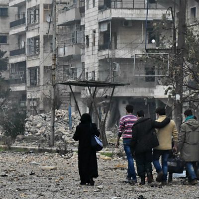 With the ceasefire in the eastern part of the Syrian city of Aleppo is now in place. However, plans to get the injured, civilians and fighters out of the city hit delays on Tuesday morning. We hear from one resident, a journalist still in eastern Aleppo, about the situatuation there. (Picture: Syrian residents in Aleppo. Credit: George Ourfalian/AFP/Getty Images)