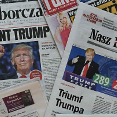 Polish politicians Dominik Tarczyński from the governing Law and Justice Party and Rafal Trzaskowski from Civic Platform discuss what the election of Donald Trump will mean for Poland. This was recorded during a World Questions debate in Warsaw, Poland. (Photo Image: Polish newspapers the day after the victory of Donald Trump Photo credit: JANEK SKARZYNSKI/AFP/Getty Images)