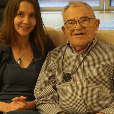 Ben Stern is a 95-year old Holocaust survivor. Lea Heitfeld is the 31-year old granddaughter of Nazis. The two of them share a home in California. Sasha Khokha went to visit (Image: Lea Heitfeld and Ben Stern are pictured here at their Berkeley, California, apartment. Credit: Sasha Khokha/KQED)