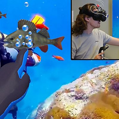 Andrew Chalmers gives Click’s Simon Morton a demonstration of enhanced virtual reality (Image caption: VR rendered Underwater Ocean – courtesy the School of Engineering and Computer Science at Victoria University of Wellington)