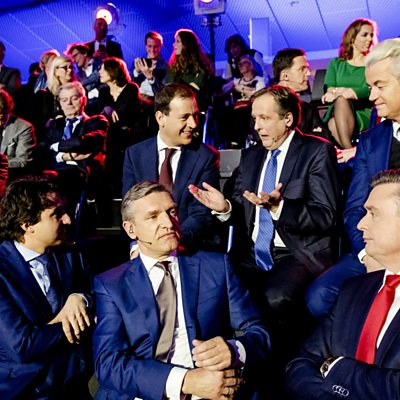 Han Ten Broeke, Member of Parliament for the People's Party for Freedom and Democracy (VVD) discusses the political power of compromise in Dutch politics. This was recorded during a World Questions debate in Amsterdam, The Netherlands. (Photo: Leaders of major Dutch political parties before an election debate ROBIN VAN LONKHUIJSEN/AFP/Getty Images)