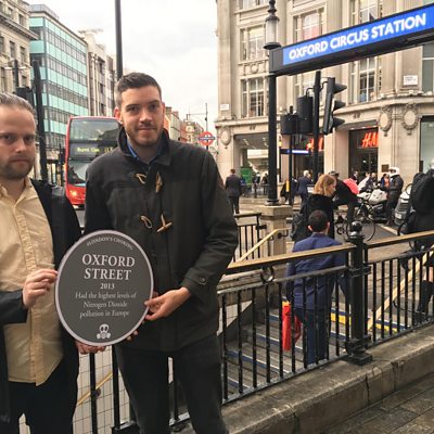 If you live in a city plagued by severe air pollution, you may know what it is like: the persistent cough, the black residue in your nose, the acrid smell of burning tyres, and the serious worries of what it can do to your lungs. The World Health Organization has been warning that air pollution now represent a global health emergency. Exhaust fumes from diesel cars and construction have been highlighted as causes. Anu Anand went to Oxford Circus in the heart of London to meet two young men who are trying to raise awareness right at street level by mimicking the city's famous Blue Plaque scheme. (Picture: Rob Donaldson (right) and Joe Dennett Credit: Tim Smith/ÃÛÑ¿´«Ã½) .