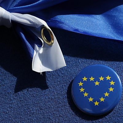 With Emmanuel Macron newly elected and Angela Merkel looking likely to be re-elected, the shape of the EU they will re-craft is becoming clearer. Damien McGuinness in Berlin. (Photo: An EU supporter wearing pro-EU symbols as President Macron of France visits Chancellor Merkel of Germany Credit: Getty Images