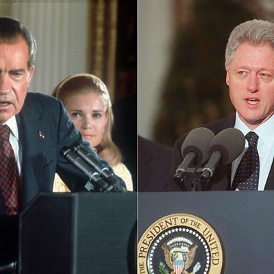 Legal scholar Ken Gormley discusses with Anu Anand two scandals that engulfed the White House - Watergate, which led to President Nixon's resignation in 1974, and the impeachment of President Clinton in 1998. Do those episodes shed any light on what to expect from the investigation by former FBI director Robert Mueller into the Trump campaign and Russia? (Photos: President Nixon announces his resignation on 9 August 1974; President Clinton speaks to reporters after the US House of Representatives impeached him on charges of perjury and obstruction of justice, 19 December 1998. Credit: Getty Images)