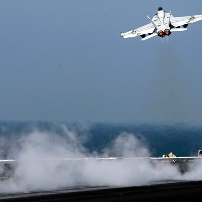 Amid the complex fighting in Syria, one of Iran's aims is to drive a road through from Tehran to the Mediterranean. US air power stands in Iran's way - for now. (Photo: A US navy plane takes off from an aircraft carrier in the Gulf Credit: AFP/Getty)