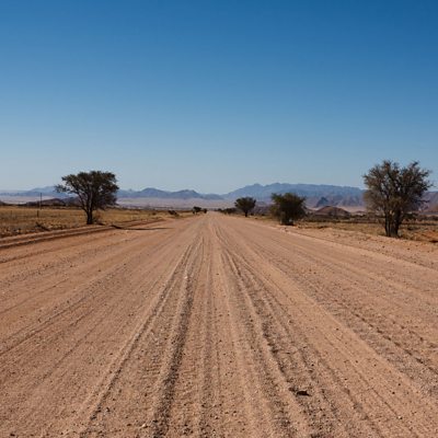 Alice Williamson, lecturer at the University of Sydney, explains to presenter Marnie Chesterton why roads made of loose sand or gravel develop regular bumps. (Image: Dirt road in Namibia Credit: Getty Images)