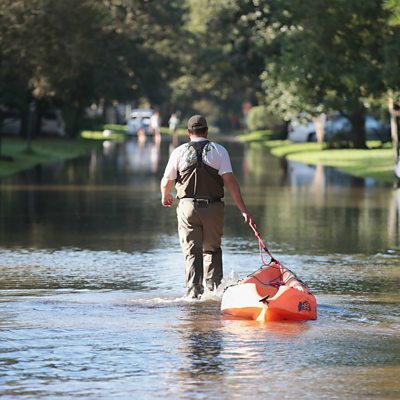 Scientists have long known that certain phenomena like rising seas and warmer temperatures are caused by climate change. But when it comes to hurricanes, things are still a little murky. Gabriel Vecchi, a professor of geosciences at Princeton University, is an expert in the emerging field of "climate attribution". (Image: People leave a neighbourhood as water continues to rise following Hurricane Harvey on August 30, 2017 in Houston, Texas. Credit: Scott Olson/Getty Images)