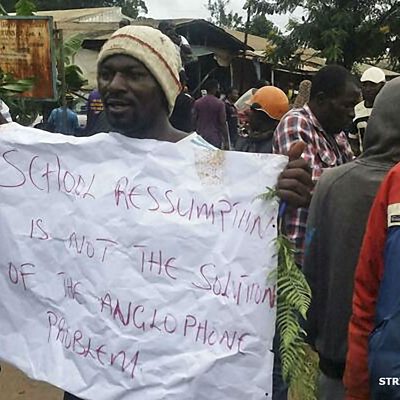 Protests have been ongoing for many months amid calls for independence in English-speaking regions of Cameroon. The rising tension among English speakers towards the government has led to deaths, injuries and arrests. At the beginning of October, soldiers killed at least eight demonstrators. Picure: Protester holding a sign Credit: STRINGER/AFP/Getty Images