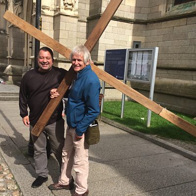 Lindsay Hamon from Cornwall travels the world with his cross for on-street evangelism.