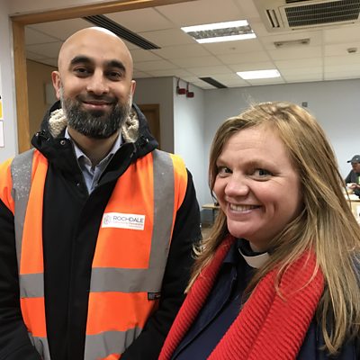 Rev Kate Bottley meets Mohammed, a volunteer at a soup kitchen in Rochdale