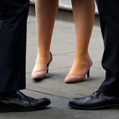 "This pay transparency is stripping away the veil and showing the pay discrimination." Labour MP Harriet Harman and head of financial institutions at ANZ bank Brenda Trenowden speak to R4’s World at One about the gender pay gap, as thousands of UK companies with more than 250 staff publish the average difference in pay between male and female employees. (Image: Legs of 2 men and one woman, credit: PA)