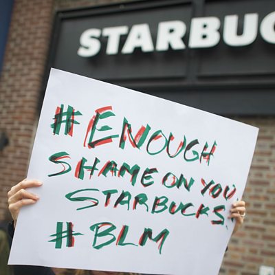 Starbucks says it will close down over 8,000 branches across the United States for an afternoon next month to carry out 'racial bias training'. It follows protests and calls to boycott the company after two black men were arrested in one of its Philadelphia branches. The pair were sitting there waiting for a friend before ordering their coffee. The closure of the stores could cost an estimated $20 million in lost sales. (Photo: A protester holds a sign outside a Starbucks store. Credit: Getty Images)