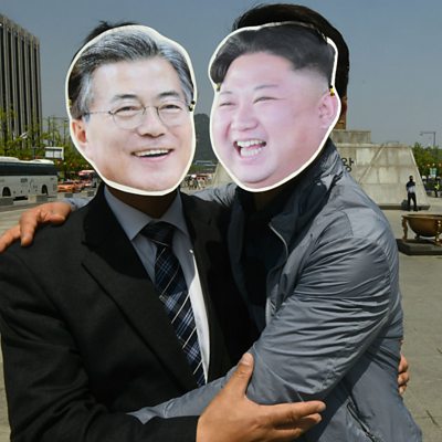 North Korean leader Kim Jong-un meets South Korean leader Moon Jae-in. It is only the third time leaders from the two nations have ever met. The countries have remained divided since the end of the Korean War and tensions have been high in recent years. Since the beginning of this year however, it seems the winds of change are blowing. ÃÛÑ¿´«Ã½ Minute looks back on key moments that have led to this historic summit. (Photo: Korean demonstrators wear masks of Kim Jong-un and Moon Jae-in. Credit: Getty)
