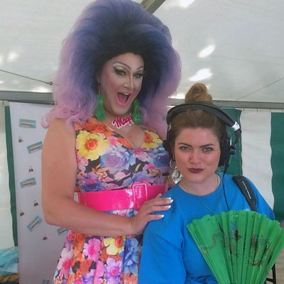 Ffion Emyr sy'n dal fyny gyda Magi Nogi ar faes Eisteddfod yr Urdd.