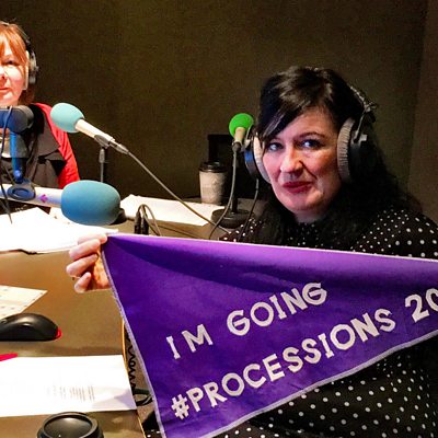Textile artist and banner maker Claire Hunter explain the history of suffragette banners as preparations are made for the Processions marches on 10th June Image shows textile artist Claire Hunter and Processions co-ordinator Jean Cameron before the Processions marches on June 10th