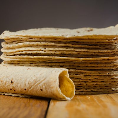 Tortilla lasagne, yoghurt custard, and deep-fried cherry-pie parcels - the answer to ending food waste and world hunger? Shirley Southworth, head cook at Fur Clemt in Wigan, England, explains how the food waste cafe simply has to deal with whatever ingredients are thrown at it. (Picture: Tortillas on a wooden table. Credit: Getty Images)
