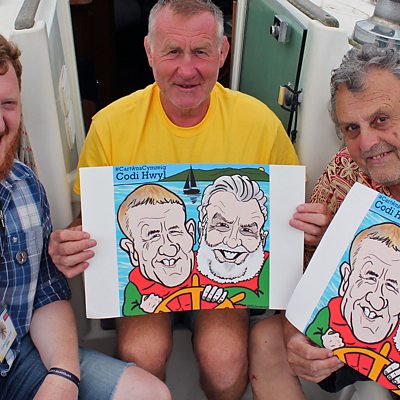 Sion Tomos Owen sy'n dal lan gyda Dilwyn Morgan a John Pierce Jones ar y Mystique.