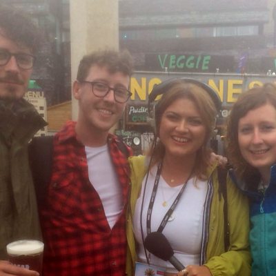 Ffion yn sgwrsio gydag Osian, Meilyr a Branwen cyn gig Candelas ar lwyfan y Maes.