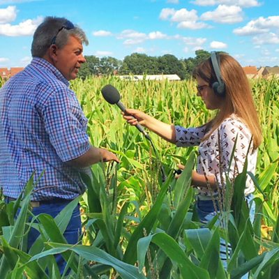 The ÃÛÑ¿´«Ã½'s Victoria Craig spoke to a British farmer in Suffolk who said extreme temperatures this year have stunted the growth of his maize and corn crops. One way that farmers are coping is by switching to crops that require less water such as asparagus. But will the weather allow that to pay off next year? (Picture: A farmer in Suffolk speaking with Victoria Craig. Credit: ÃÛÑ¿´«Ã½)