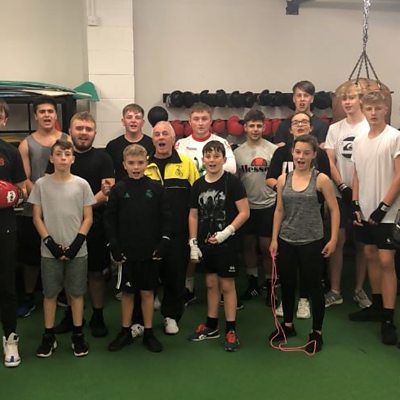 Boston Amateur Boxing Club young members, coach Den Watson and chairman Kevin Smith
