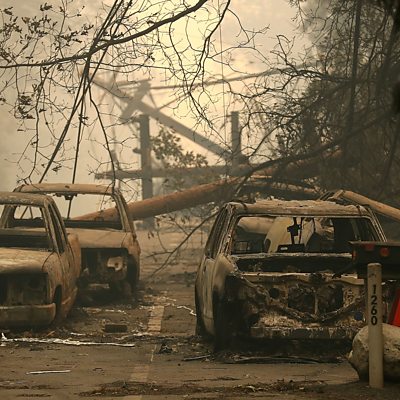 Most of the town of Paradise, California, in the Sierra Nevada foothills, has been obliterated by raging wildfires. Ellen VandenBerg considers herself lucky to be alive. (Power lines rest on cars that were burned by the Camp Fire in Paradise, California. Credit: Justin Sullivan/Getty Images)
