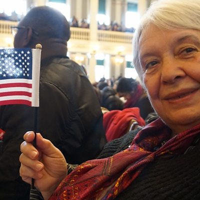 Natalia Malkes recently became a US citizen at 78. She had lived her whole life in Russia, and now she's an American. But does becoming a US citizen make her feel any different? (Image: Natalia Malkes waves a flag during her citizenship ceremony at Faneuil Hall in Boston, Massachusetts on Nov. 15, 2018. (Credit: Daniel Ofman/The World)