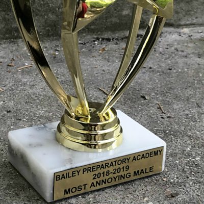 An autistic child in the US has been awarded a "most annoying male" of the year trophy, presented by his teacher at an end-of-school ceremony. His parents, Rick and Estella, were there when it was handed to their son. US media has reported that the school in northwestern Indiana has apologised, and taken disciplinary action against some members of staff. ÃÛÑ¿´«Ã½ World Service has contacted the school for comment. (Photo: 'Most Annoying Male' trophy. Credit: Rick, father)