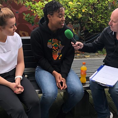 Nicole McClure and Lauren Brennan speak to Eric White ahead of Cup Final