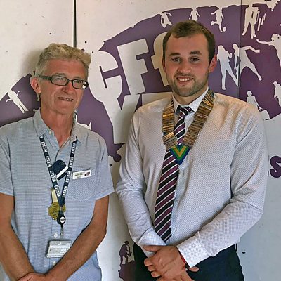 Aeth Geraint Lloyd i gyfarfod Cadeirydd Newydd Clybiau Ffermwyr Ifanc Cymru, Dafydd Jones.