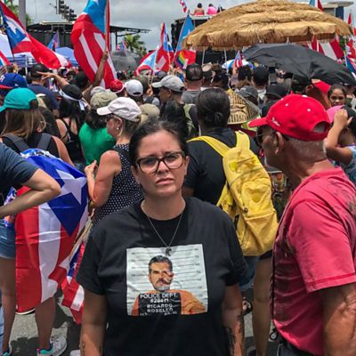 In Puerto Rico #RickyRenunció has been trending on social media - it means "Ricky quits". Governor Ricardo Rosselló has now announced he will resign. He has been at the centre of a group text message scandal. The leaked messages revealed sexist and homophobic comments. On Sunday he said, "I have made mistakes and I have apologised." Several of the texts mocked victims of Hurricane Maria that devastated the island in 2017. It is thought the hurricane may have led to more than 4,000 deaths. Hundreds of thousands of protesters demanded he quit and there were celebrations on the streets of the capital San Juan when he made his announcement on Wednesday. Maria is one of the demonstrators. (Photo: Maria at the protests. Credit: Maria)