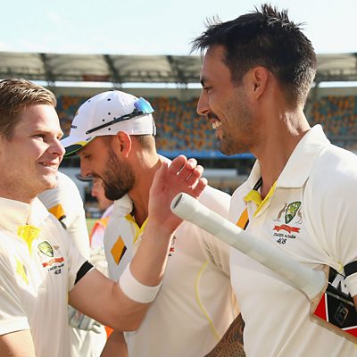 Former Australian bowler Mitchell Johnson speaks about his former team-mate Steve Smith. He tells us about Smith's comeback, the emotions that he has had to overcome and his first Test century since his return. Photo: Steve Smith and Mitchell Johnson embrace in 2014 (Getty Images)