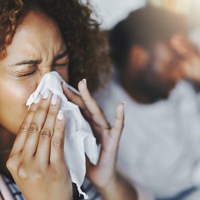 Most colds are caused by rhinoviruses, but there are around 160 different types and they mutate very easily or learn to hide from the immune system. James Gallagher, the ÃÛÑ¿´«Ã½'s health and science correspondent, spoke to Claudia Hammond about how researchers have been targeting an essential protein inside our cells which the viruses need to replicate. (Image: Woman with flu sneezing. Credit: Getty Images.)