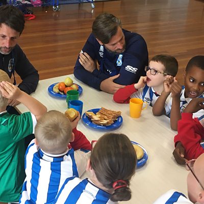 Huddersfield Town bosses Danny & Nicky Cowley visit Lowerhouses School Breakfast Club.
