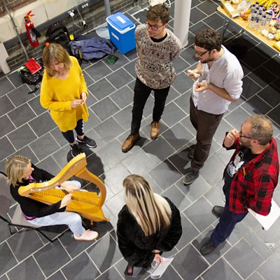 Gareth Bonello, Gai Toms, Casi, Sian James, Iestyn Tyne a Gwenan Gibbard yn perfformio caneuon sesiwn Unnos Gwerin.
