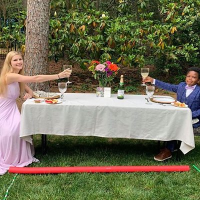 When 17-year-old Rachel Chapman's prom was cancelled because of the coronavirus pandemic, 7-year-old Curtis, who she babysits, decided to surprise her with his own version. Curtis held a socially distanced dinner and a dance in his back garden for Rachel. He served some of their favourites: apple slices with peanut butter, Chick-fil-A and smoothies. His mother, Elissa Rogers, explained how he came up with the idea. (Photo: Rachel Chapman and Curtis Rogers. Credit: Becky Chapman)