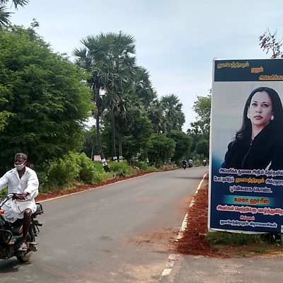 They may be thousands of miles from America, but residents of Thulasendrapuram in Tamil Nadu are taking special notice of today's US presidential election. The south Indian village is the place Kamala Harris's maternal grandfather was born and raised, before the family headed to the US. Now villagers are praying for her success in the temple established thanks to donations from her family - while her picture is proudly displayed on posters around the village. The ÃÛÑ¿´«Ã½'s Tamil service correspondent Pramila Krishnan is in the village. (Photo: A motorcyclist drives past a billboard celebrating Kamala Harris in Thulasendrapuram. Credit: Reuters)