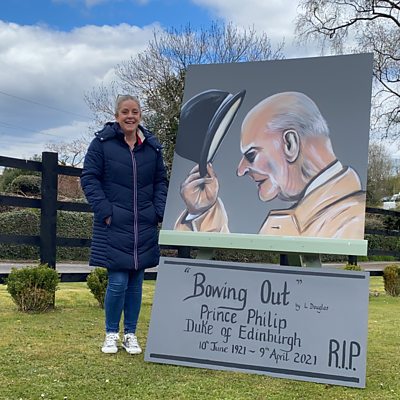 Lorraine Douglas lives with chronic pain and uses painting as a way to get her through nights when she's unable to sleep. She hadn't painted since her schooldays and was inspired during the pandemic to give it another go. In displaying her artwork on her driveway in Allesley in Coventry she's learnt from others that her paintings have helped them to get through lockdown. This piece is called Bowing Out and is a tribute and thank you to the service given by Prince Philip.