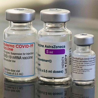 New data has been released on mixing vaccines: that’s having one type of vaccine for your first dose and a different type of vaccine for your second. ÃÛÑ¿´«Ã½ health and science correspondent James Gallagher discusses the findings. (Image: Three vials with different vaccines. Credit: Thomas Kienzle/AFP/Getty Images.)