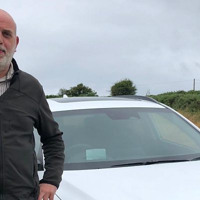 Wil Parri yn trafod car trydan sydd ar gael i’w logi ym Mhen Llŷn