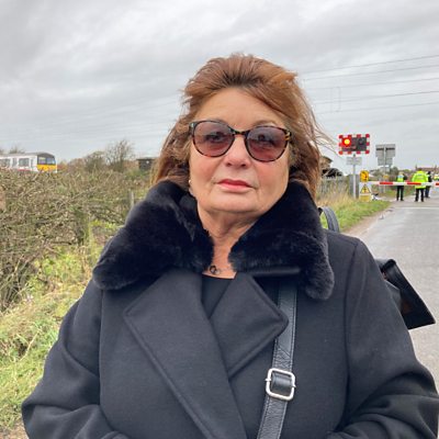 Sandra Roscoe's car got hit by a train on a level crossing in Frating. She says she stopped in time but a car slid on ice and hit her from behind, pushing her onto the tracks.