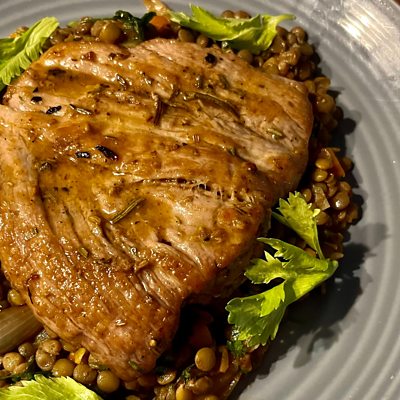 Pork Florentine with braised lentils and balsamic grilled onions