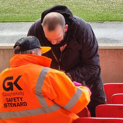 A York City Knights steward helps an elderly fan who was shivering in the cold and rain.