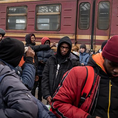 Hundreds of young African and Asian students fled Ukraine when the invasion started in February. The ÃÛÑ¿´«Ã½ has been in contact with two of them, both Nigerian students. Esekwu was studying in the eastern city of Kharkiv and crossed the border into Hungary. Peace was in the capital Kyiv and is now in Krakow, in Poland. Esekwu describes how two other medical students, from Austria and Norway, helped him when he first arrived. Peace says she has met a number of other Africans in Poland. Both say they are planning on staying in Europe, as the situation is unstable in Nigeria, and they can take advantage of better internet connections, to continue their studies. Peace says her university in Ukraine has been in touch, and that her course will resume online. "By God's grace, the insurgency will end." Eskekwu, a Nigerian student currently in Hungary Photo: African students arrive in Lviv, Ukraine, from Sumy, March 2022 Credit: Getty Imagesos