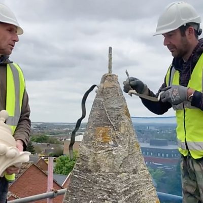 Kelly Morgan goes to see a new finial being fitted after storm Eunice
