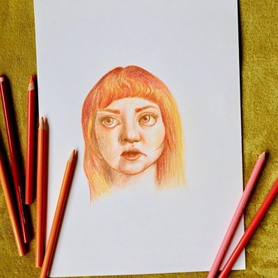 Isobel, who has a cleft lip and palate, hosts classes for people with visible differences. Drawing of Isobel by Rebecca Harte Art.