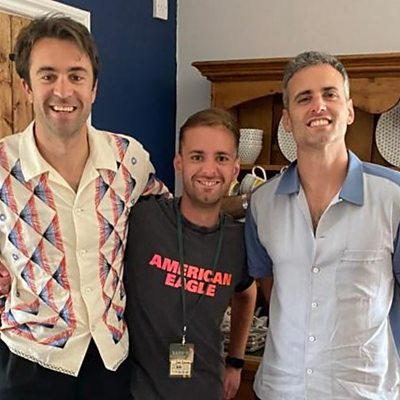 Jon meets Justin and Freddie from the Vaccines ahead of their Barn on the Farm 2022 set.