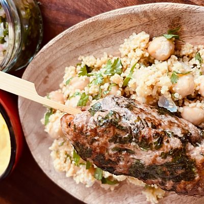 Lamb Koftas with Chickpea Couscous Salad, Mint Chutney and Yoghurt Dressing