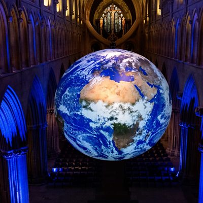 Artist Luke Jerram's seven-metre diameter sculpture of the earth is hanging in the nave. The giant globe is created from high-resolution NASA images. Luke tells Matt Faulkner he hopes people get sense of what it might be like floating above the earth and looking down at the planet. Image: Wells Cathedral