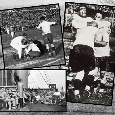 FIFA's inaugural tournament in Uruguay was packed with drama - controversies on the pitch, intense local rivalries and, for the European teams, a daunting month-long expedition just to get there. Philippe Vonnard and Andreas Campomar share some of the most notable stories with Rajan Datar. This clip is from The Forum: Uruguay 1930: The first football World Cup. (Pictures: A player being treated for an injury during the 1930 FIFA World Cup final in Uruguay, Uruguayan players celebrating a goal, and the French football team on board the Conte Verde. Credit: ullstein bild, Hulton Picture Library/Allsport, Staff/AFP, Getty Images, ÃÛÑ¿´«Ã½)