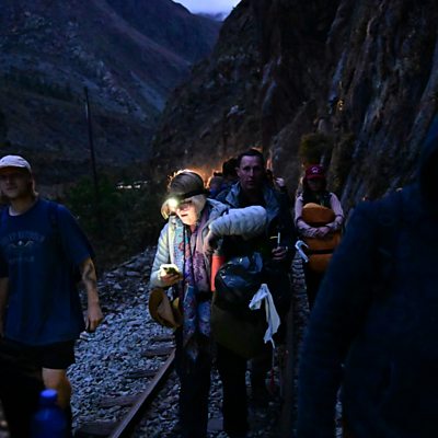 In Peru hundreds of tourists who were stranded at the world heritage site of Machu Picchu are finally being evacuated by the Peruvian government.  Thousands of visitors and Peruvians were stuck for days in various locations as protesters blocked roads and forced airports to close. The main railway tracks near to the site had been blocked since last week by anti-government protests. There's been some violence, with more than 20 people killed across the country. Most travellers stuck in the remote village of Machu Picchu hiked nearly 30 kilometres by foot, to reach the town of Ollantaytambo. From there people tried to find a way to get to the main town of Cuzco. And from there a flight out to the capital Lima or to their final destination. Tony and Coleen Hepburn, from Vancouver, were with one of the groups stuck in Machu Picchu. They trekked from Machu Picchu to Ollantaytambo where they could get then transport to Cuzco and eventually out of Peru. Tony spoke to Outside Source about what they saw: "The driver [taking us to Ollantaytambo] stopped 500m short from the blockade... there was a mass of people that started running towards us...one guy was holding a sickle, another had a knife who slashed the tyres of the van, the guy with the sickle kicked our driver, punched him in the head and then they dragged him off..." (Photo: Stranded tourists who were visiting the Inca citadel of Machu Picchu walk along the railway track to Ollantaytambo, Peru, on December 17, 2022. Credit: Getty Images)